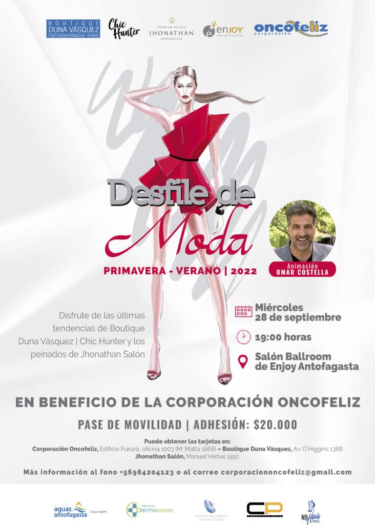 La Corporación Oncofeliz realiza un especial invitación a la comunidad antofagastina para unirse a su noble causa, en esta oportunidad, con una nueva versión del Gran Desfile de Moda Primavera Verano 2022, el cual se llevará a cabo en Enjoy Antofagasta.