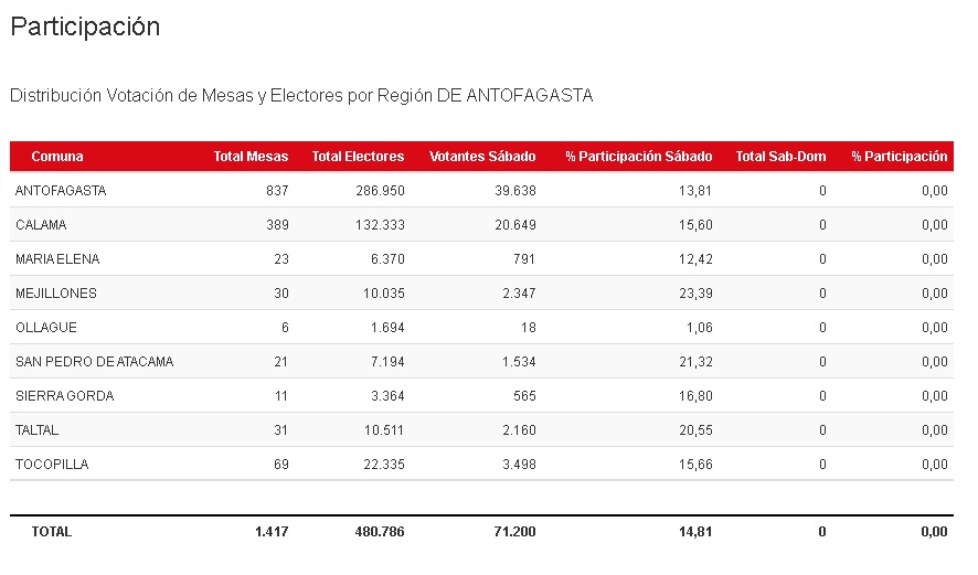 En la jornada anterior solo un 15% de la población votante cumplió con el deber cívico, participando mayoritariamente la comuna de Mejillones con un 23,9%, mientras que Antofagasta solo obtuvo un 13% de participación durante el sábado, dejando además un saldo de 17 detenidos por negarse a ser vocales de mesa y un local comercial clausurado por infringir la Ley Seca.