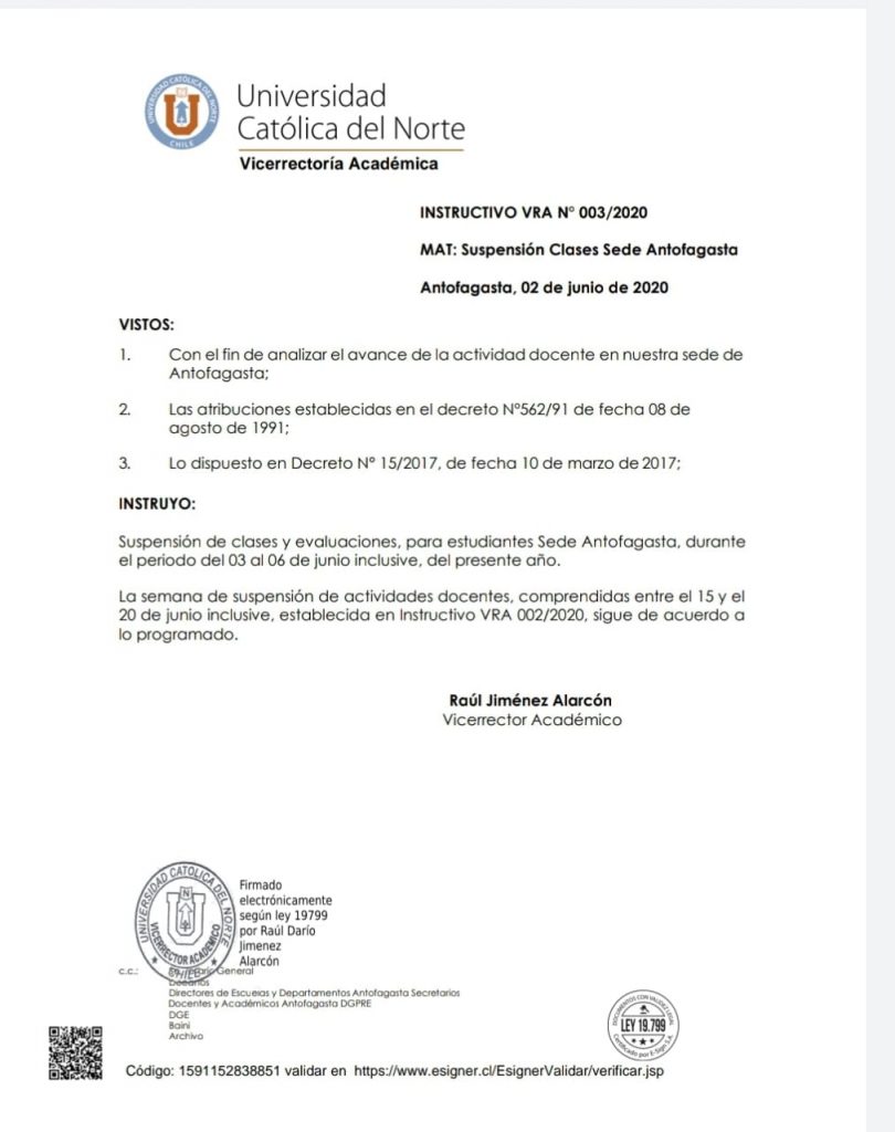 Asimismo, la Vicerrectoría de la Universidad Católica del Norte hace visible el comunicado en donde informan la suspensión de clases para los estudiantes de la Sede de Antofagasta, para el periodo del día 3 al 6 de junio, los estudiantes el día 1 de junio realizaron las votaciones para el paro reflexivo.