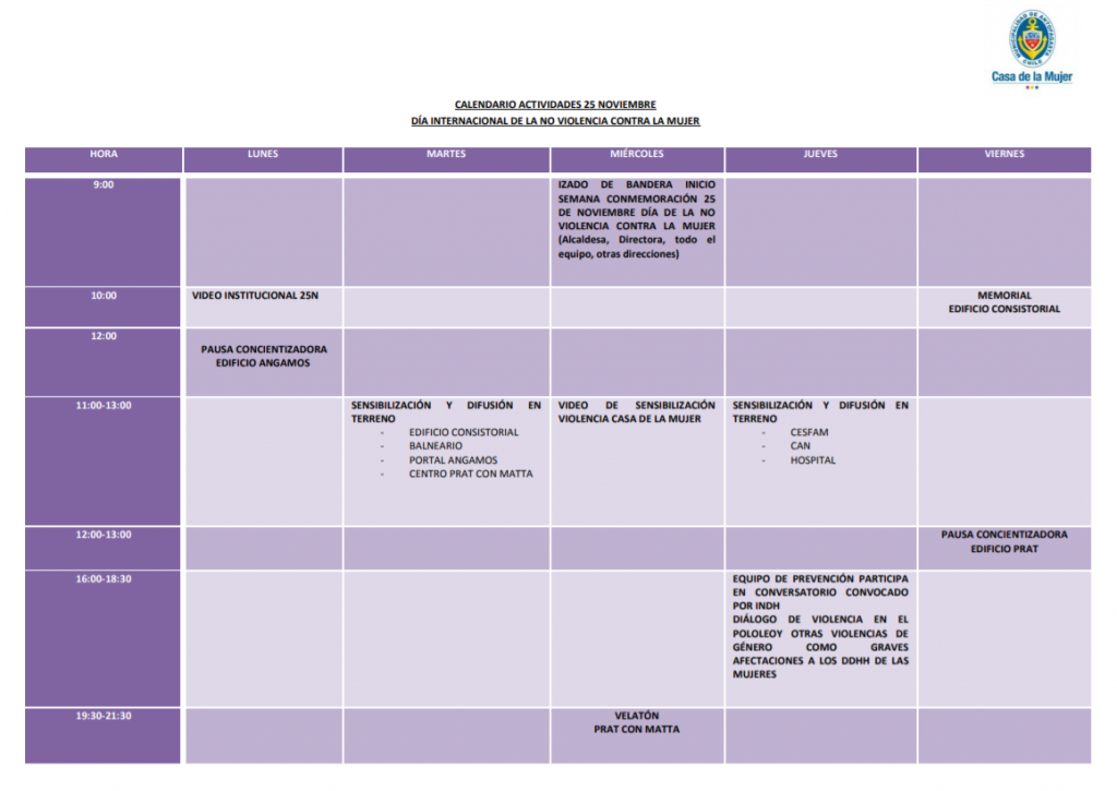 Este próximo miércoles 25, en la explanada de la Municipalidad, se izará la bandera morada como símbolo de la conciencia de la libertad y dignidad de la mujer. Agregando distintos encuentros que se llevarán a cabo en sectores como el Balneario Municipal, Intersección de Pratt con Matta, Portal Angamos, Edificio Municipal, en todos los CESAM y en el Hospital Regional. Finalizando el viernes 27 con la confección de un memorial en el edificio consistorial, el cual quedará en el lugar para ratificar los derechos e igualdad que poseen tanto hombres como mujeres.