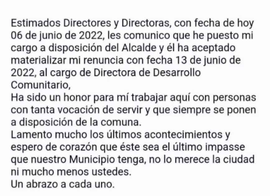 Se trata de Cary Pena Cariola, Directora de la Dirección de Desarrollo Comunitario (Dideco), quien mediante una carta dirigida a los directores, funcionarios y concejales, informó que presentó su renuncia al cargo.