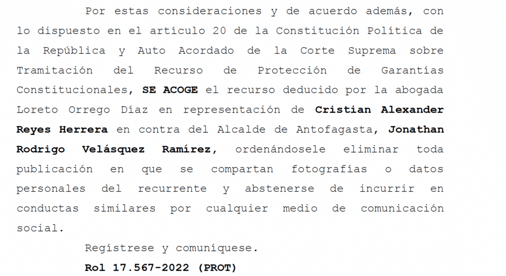 El propio portal oficial del Poder Judicial dio a conocer la información, bajo el titulo “Corte de Apelaciones ordena a alcalde eliminar publicaciones con datos personales de periodista”.