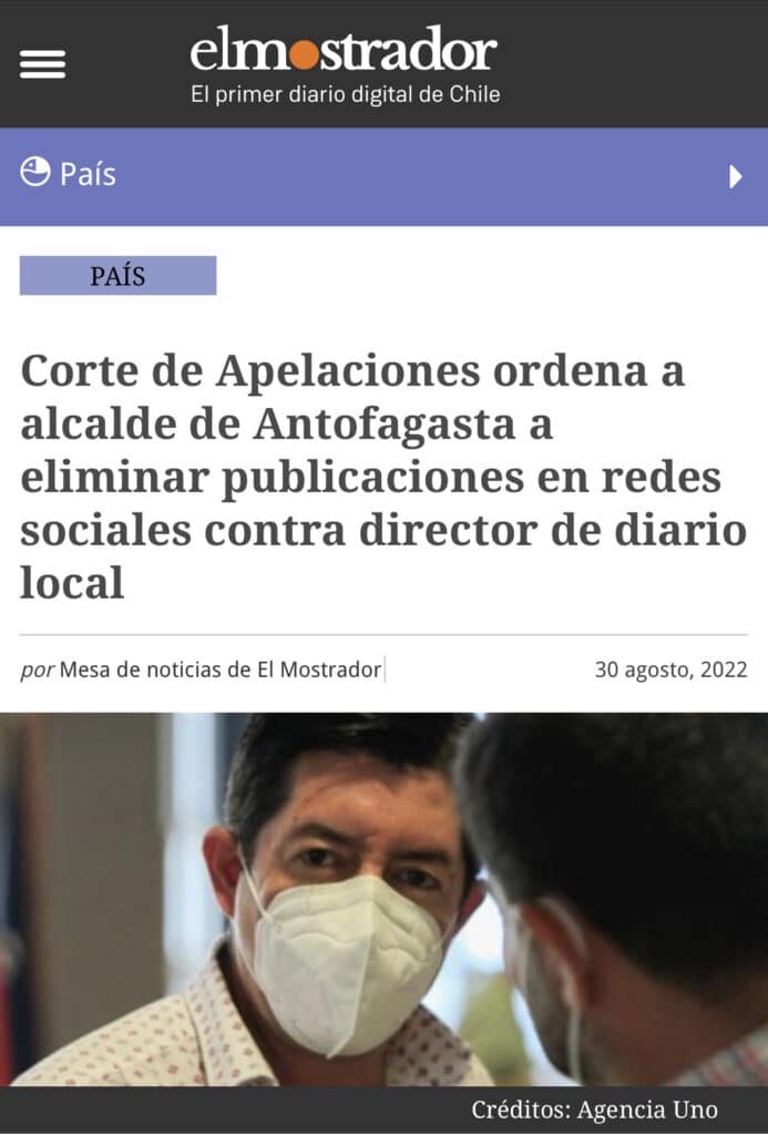 El diario electrónico El Mostrador, consignó que la “Corte de Apelaciones ordena a alcalde de Antofagasta eliminar publicaciones en redes sociales contra director de diario local“.