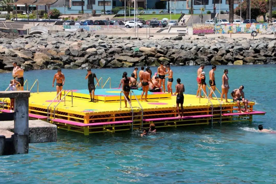La estructura —una plataforma cuadrada de 10 por 10 metros, con capacidad para 200 personas— fue completamente recuperada y modernizada, manteniendo su esencia como punto de encuentro para generaciones de antofagastinos que hicieron del trayecto a nado hasta la balsa un verdadero rito veraniego.