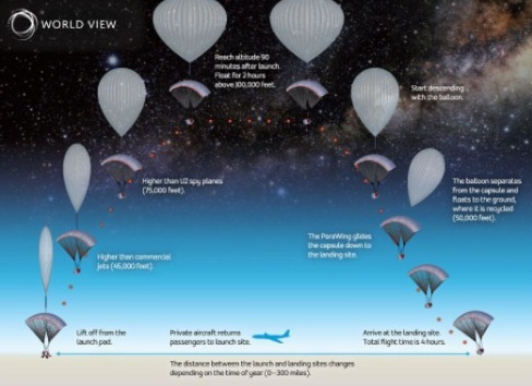 La mayoría de los vuelos flotarán entre 100.000 y 105.000 pies sobre la superficie de la Tierra. Su horizonte se extenderá en la distancia más de 1,000 millas en todas direcciones y la altura precisa variará según el puerto espacial de salida.