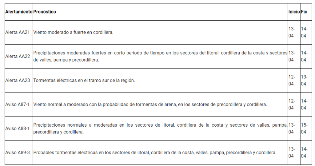 Cabe destacar que Senapred, había emitido Alerta Temprana Preventiva para la región de Atacama por la ocurrencia de eventos meteorológicos (lluvias, tormentas eléctricas y vientos).