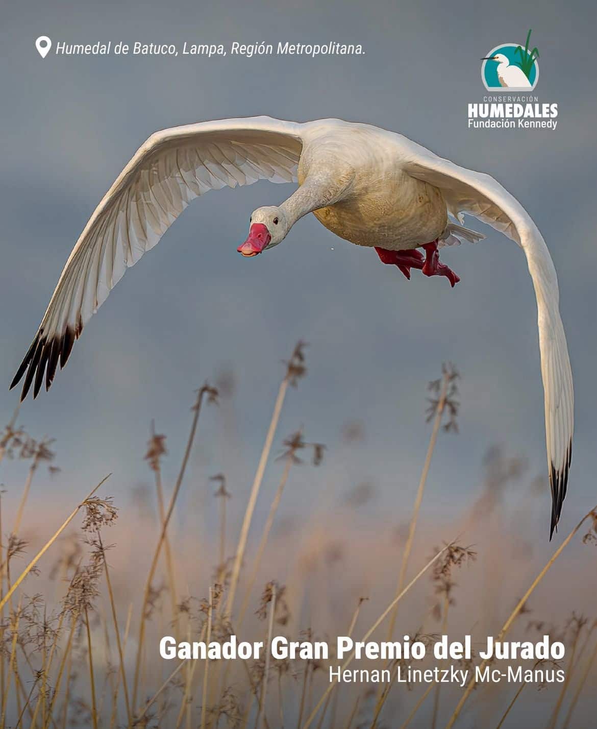 Hernán Linetzky Mc-Manus, de 72 años, obtuvo el máximo reconocimiento con una captura realizada en el Humedal de Batuco, en Lampa (Región Metropolitana). Su fotografía destaca por su técnica, sensibilidad y fuerza visual, logrando retratar el vuelo de un cisne coscoroba en un momento de conexión directa con la naturaleza.