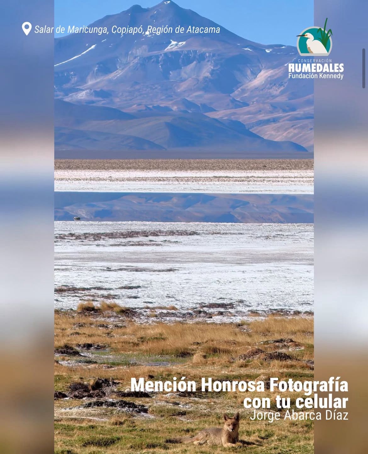 Jorge Abarca Díaz (38 años) fue reconocido por su imagen en el Salar de Maricunga (Copiapó, Atacama), donde un zorro culpeo descansa con el volcán al fondo. Un recordatorio de que para conectar con la naturaleza solo basta detenerse… incluso con el celular en el bolsillo.