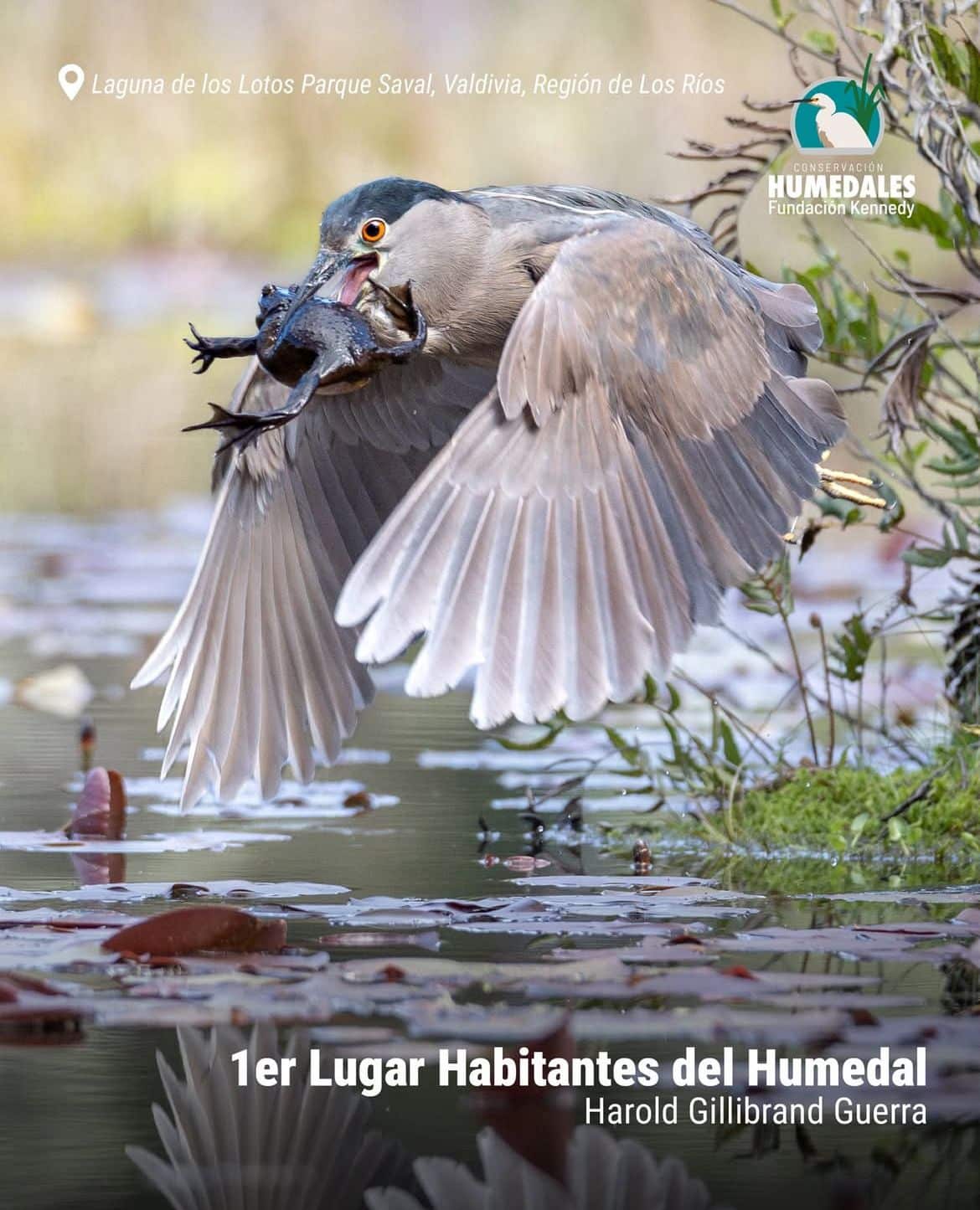 Laguna de los Lotos, Parque Saval, Valdivia. Mientras fotografiaba ranas chilenas, logró capturar el instante en que un huairavo atrapa su presa, una escena tan cruda como reveladora de la vida salvaje.