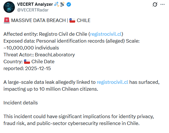 La empresa especializada en ciberseguridad, “Vecert”, publicó en sus redes sociales un supuesto hackeo que afectaría a casi 10 millones de usuarios del Registro Civil.