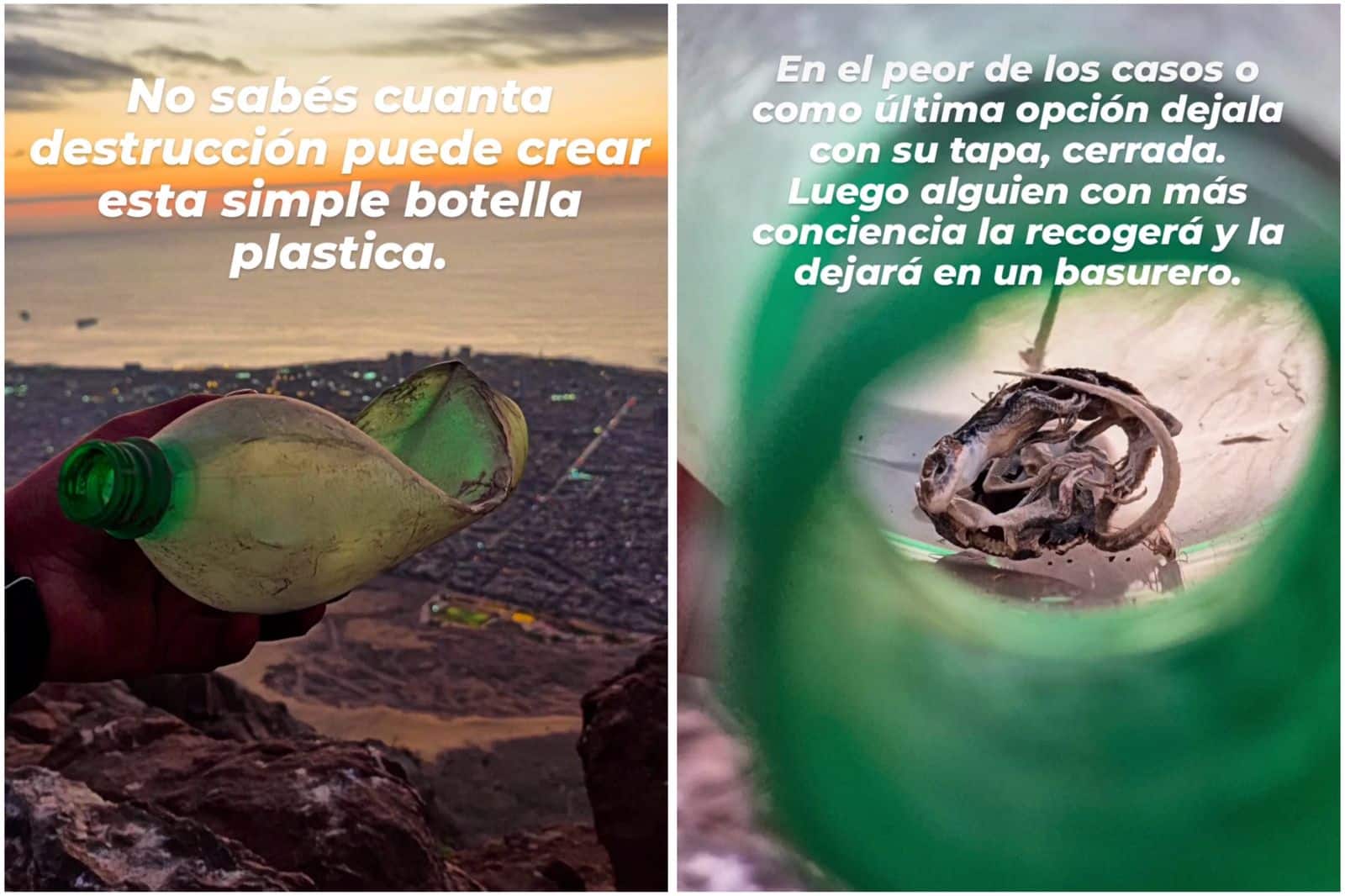 A través de sus historias en Instagram, la agrupación mostró el hallazgo entre los desechos del sector, acompañado del mensaje: “No sabes cuánta destrucción puede crear esta simple botella plástica”. En la siguiente imagen, se aprecia el interior del envase con pequeños animales muertos, evidenciando el grave daño que puede provocar un residuo abandonado en lugares donde habita fauna silvestre.