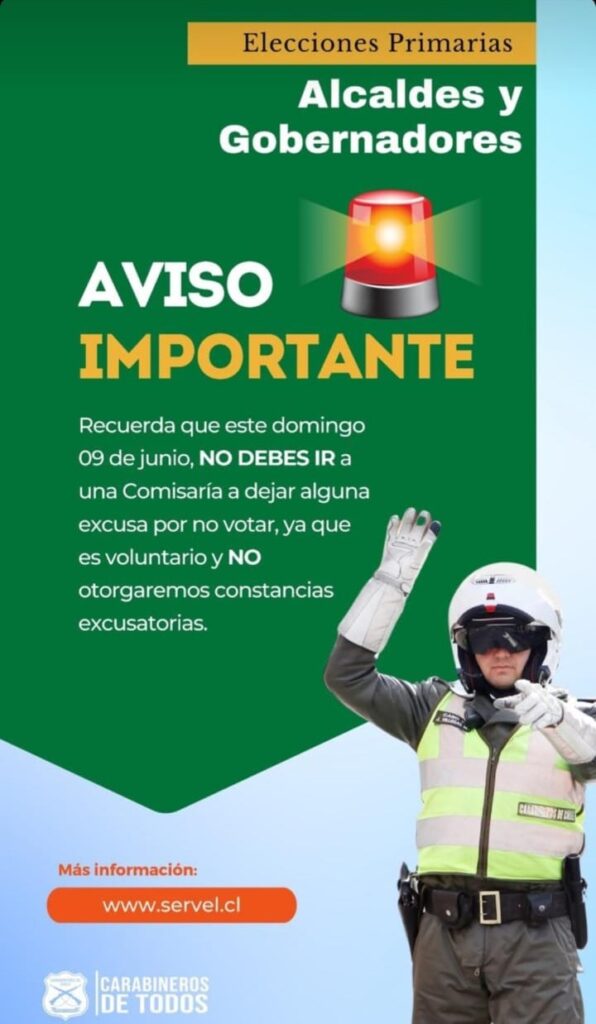 En esta ocasión, las votaciones son de carácter voluntario, por lo que Carabineros informó que “No debes ir a una Comisaría a dejar alguna excusa por no votar, ya que es voluntario”.
