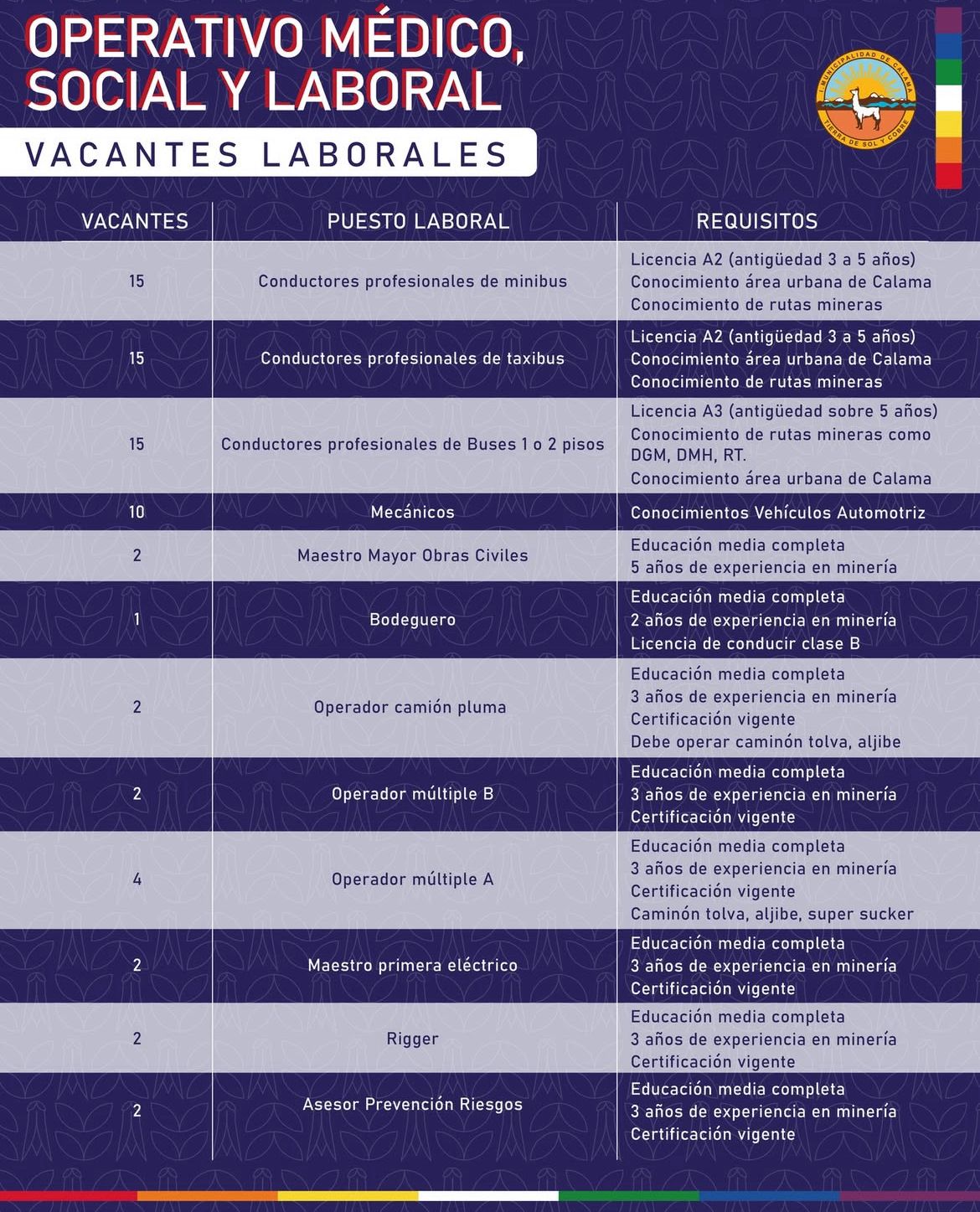 Además, el operativo ofrecerá un importante espacio laboral, con más de 60 vacantes disponibles en distintos rubros. Entre ellas destacan: conductores profesionales de buses, taxibuses y minibuses, mecánicos, maestros en obras civiles y electricidad, operadores de maquinaria, bodegueros, riggers y asesores en prevención de riesgos.