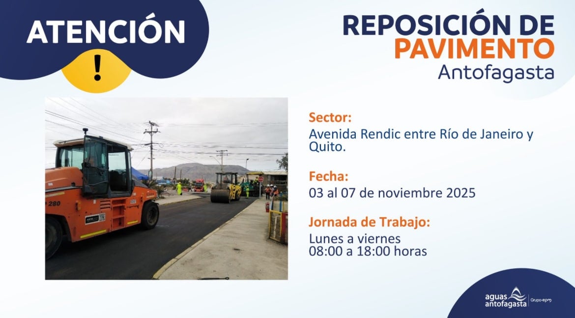 Aguas Antofagasta informó que entre este lunes 3 y viernes 7 de noviembre, se llevarán a cabo labores de reposición de pavimento en la Avenida Antonio Rendic, específicamente entre Río de Janeiro y Quito, como parte de los trabajos de mejora realizados previamente en la red de agua potable en el sector norte de la ciudad.