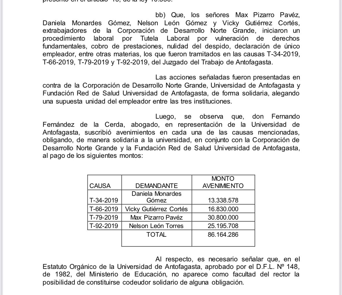 Según la resolución N°14524–14575 del 2 de octubre de 2025 que aprueba un sumario administrativo y propone medidas disciplinarias, la Universidad de Antofagasta asumió el pago de indemnizaciones laborales a exfuncionarios de la Corporación de Desarrollo Norte Grande, entidad privada que administraba el hospital clínico de la UA.