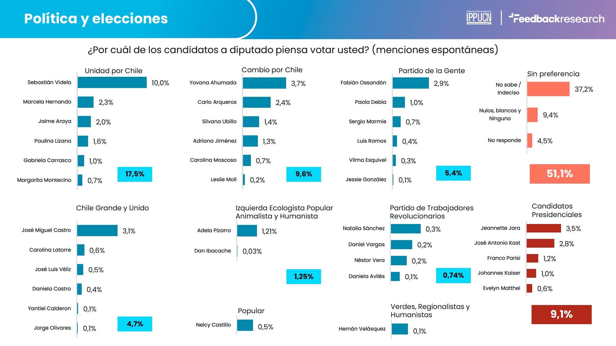 En el caso de los candidatos a diputado, Sebastián Videla es el único con más de un 10% en menciones espontáneas, superando ampliamente a otros candidatos y listas. Le sigue en menciones espontáneas Yovana Ahumada con un 3.7%, José Miguel Castro con un 3.1% y Fabián Ossandón con un 2.9%.