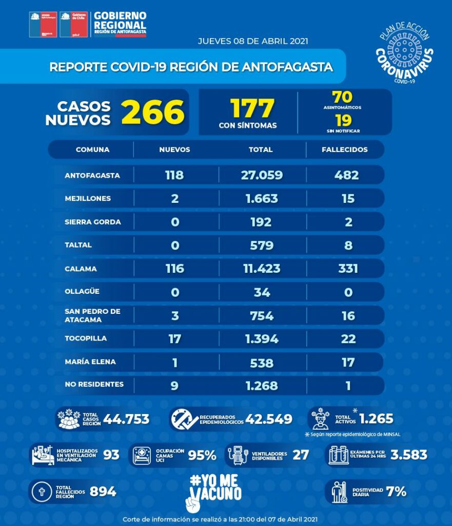 Lamentablemente, durante las últimas 24 horas, la región registró 7 personas fallecidas producto del coronavirus, de los cuales cuatro pertenecen a Antofagasta, dos a Calama y una a Tocopilla, aumentando la cifra de decesos a 894.