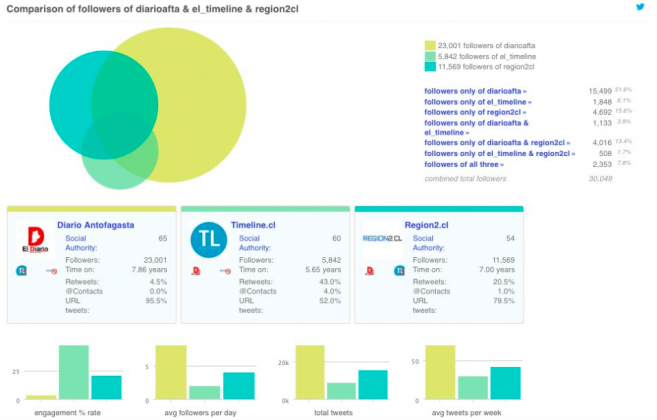Las estadísticas son aún más elocuentes en Twitter, donde Diario Antofagasta posee un mayor número comparativo de seguidores activos reales en twitter y una mayor proporción de sus seguidores se ubican en la elite de ‘top influencers’.