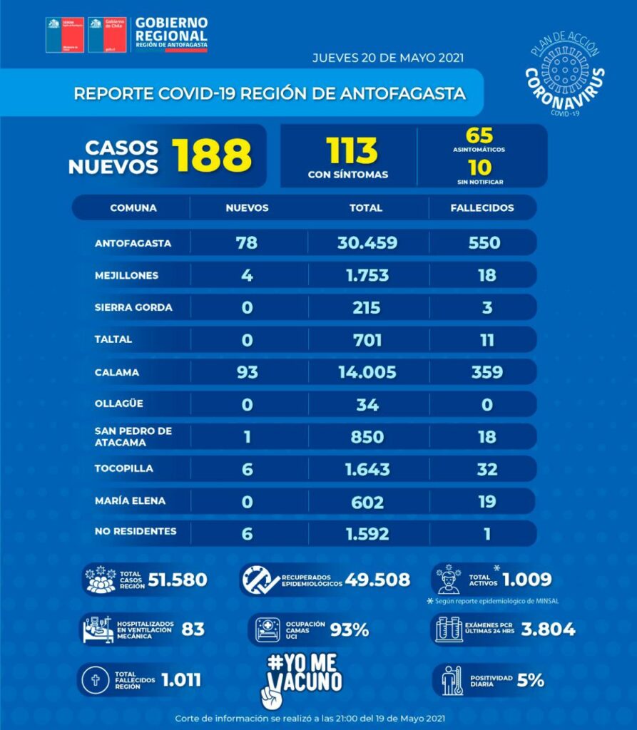Por otro lado, la ciudad de Tocopilla que actualmente se encuentra en Fase 3, retrocederá a fase 2 el próximo sábado 22 de mayo a las 5 de la madrugada por los niveles de contagio que presenta la localidad, la cual suma 32 fallecidos a la fecha.
