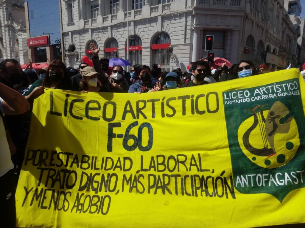 Los funcionarios de la salud y educación se reunieron en la sede de la Corporación Municipal de Desarrollo Social de Antofagasta (CMDS) y realizaron una marcha hasta llegar al centro de la ciudad, usando pancartas, tambores y carteles como medio de protesta para informar a los transeúntes.