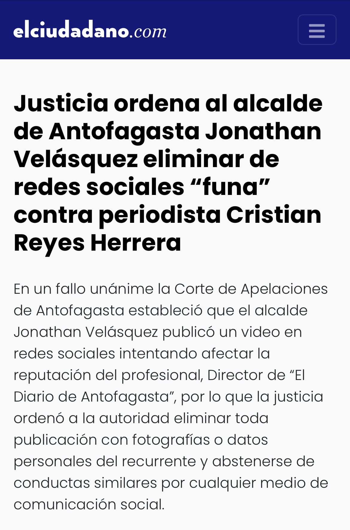 Diferentes medios de comunicación de la región de Antofagasta y el país, destacaron el fallo unánime de la Corte de Apelaciones, que ordena al alcalde Jonathan Velásquez eliminar toda publicación con fotografías y datos personales del periodista Cristian Reyes Herrera, director de El Diario de Antofagasta, además de abstenerse de incurrir en conductas similares por cualquier medio.