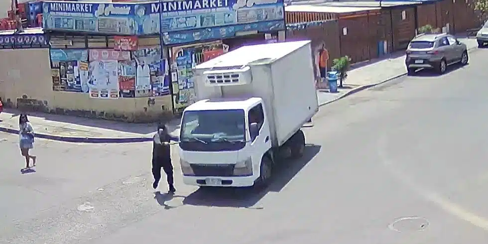 Trascurrido tan solo unos segundos, aparece un hombre, quien se sube al camión, lo hace partir y lo roba del lugar.