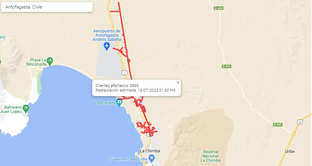 La empresa CGE, mediante su mapa de zonas afectadas por cortes de suministro eléctrico, informó de un gran corte de luz en el sector norte de Antofagasta.