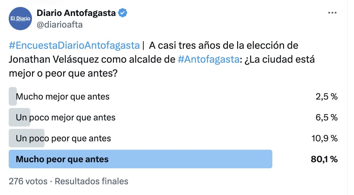 “A casi tres años de la elección de Jonathan Velásquez como alcalde de Antofagasta: ¿La ciudad está mejor o peor que antes?“, fue la pregunta planteada en las redes sociales instagram y “X”, obteniéndose en ambas resultados categóricamente similares.