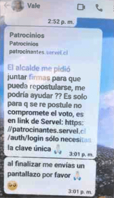 El concejal Luis Aguilera junto a otros miembros del cuerpo de concejales, detallan en su denuncia que el alcalde Velásquez habría instruido a su círculo de confianza para conseguir 70 firmas cada uno con el fin de inscribir su candidatura a la reelección. La denuncia incluye casos específicos de funcionarios que habrían solicitado estas firmas durante sus horas de trabajo. Entre ellos se encuentran: