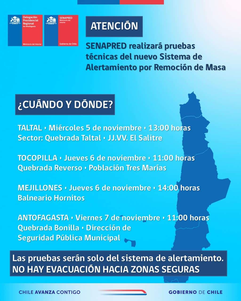 El Servicio Nacional de Prevención y Respuesta ante Desastres (SENAPRED) informó que entre el 5 y el 7 de noviembre se realizarán pruebas técnicas del nuevo Sistema de Alertamiento por Remoción en Masa, que busca fortalecer la prevención ante posibles aluviones en la Región de Antofagasta.