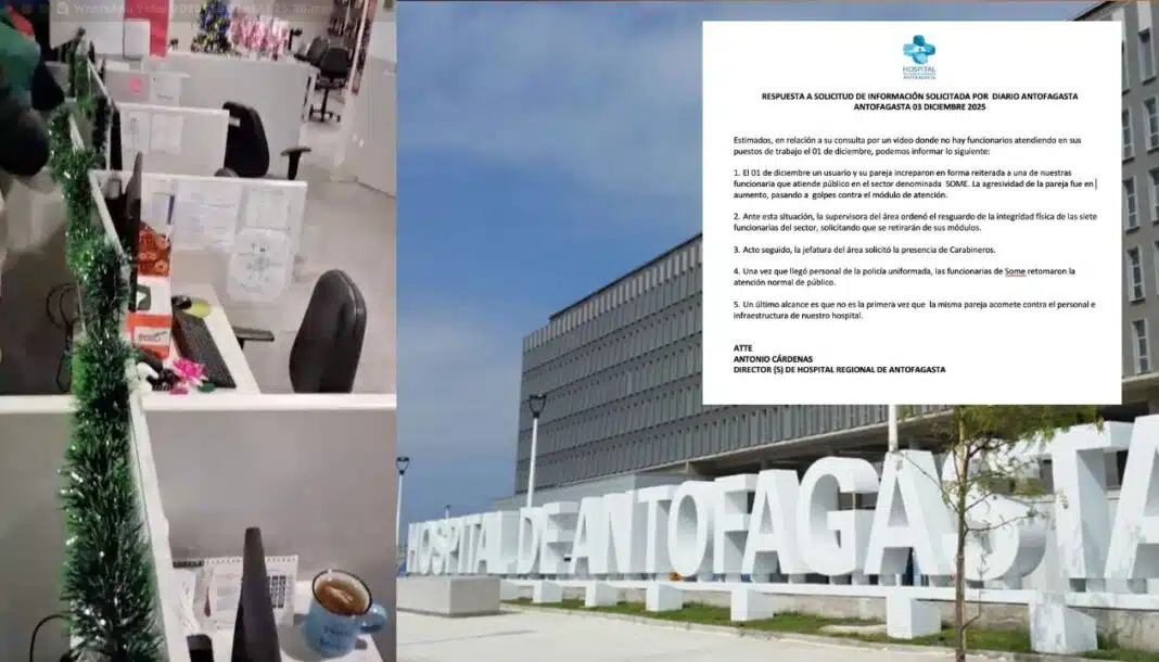 El Hospital Regional de Antofagasta se refirió al video ampliamente difundido en redes sociales, que muestra módulos de atención vacíos y sin funcionarios atendiendo público —especialmente adultos mayores y pacientes crónicos— que requerían agendar horas médicas en el sector del SOME, señalando que el hecho se produjo debido a una agresión de un usuario y su pareja, quienes habrían golpeado el módulo de atención y hostigado a una trabajadora.