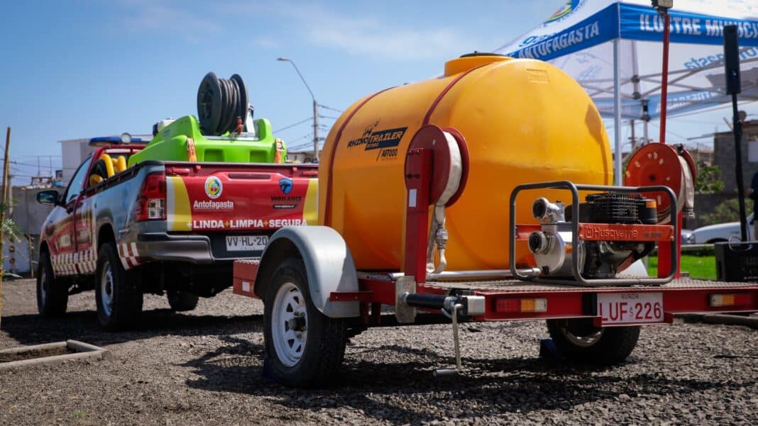 La estrategia municipal para erradicar las quemas ilegales en el sector norte de Antofagasta dio un nuevo paso con la puesta en marcha de una unidad de primera respuesta ante incendios. Se trata de un vehículo acondicionado con el “Sistema Fire Defence”, que incluye un estanque de 1.000 litros y un carro de arrastre de apoyo con otros 1.100 litros, sumando una capacidad total de 2.100 litros de agua. Este dispositivo, que cuenta con motobombas de alta potencia y respaldo, será operado por cuatro funcionarios debidamente entrenados en tácticas de control de fuego, garantizando una cobertura 24/7 en el área del ex vertedero.