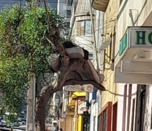 ¡Insólito! Captan a persona durmiendo con un colchón arriba de un árbol en pleno centro de Antofagasta
