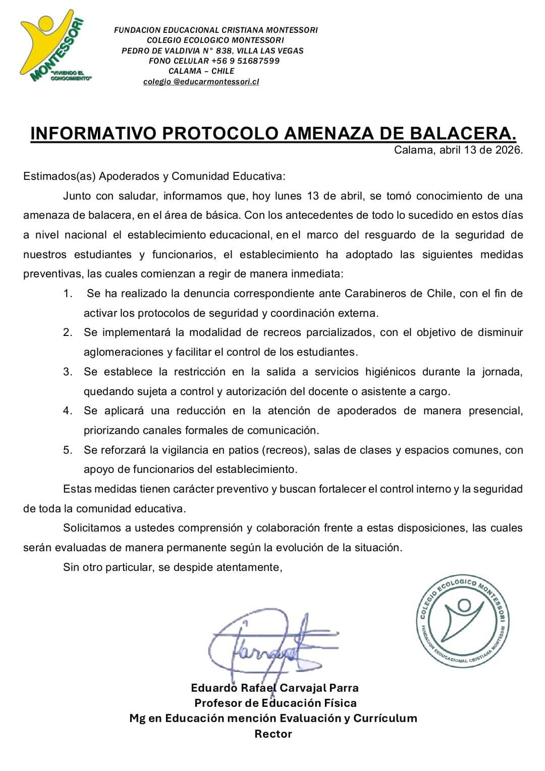 Durante la jornada de este lunes 13 de abril se recibió una amenaza de Balacera en el Colegio Ecológico Montessori de Calama.
