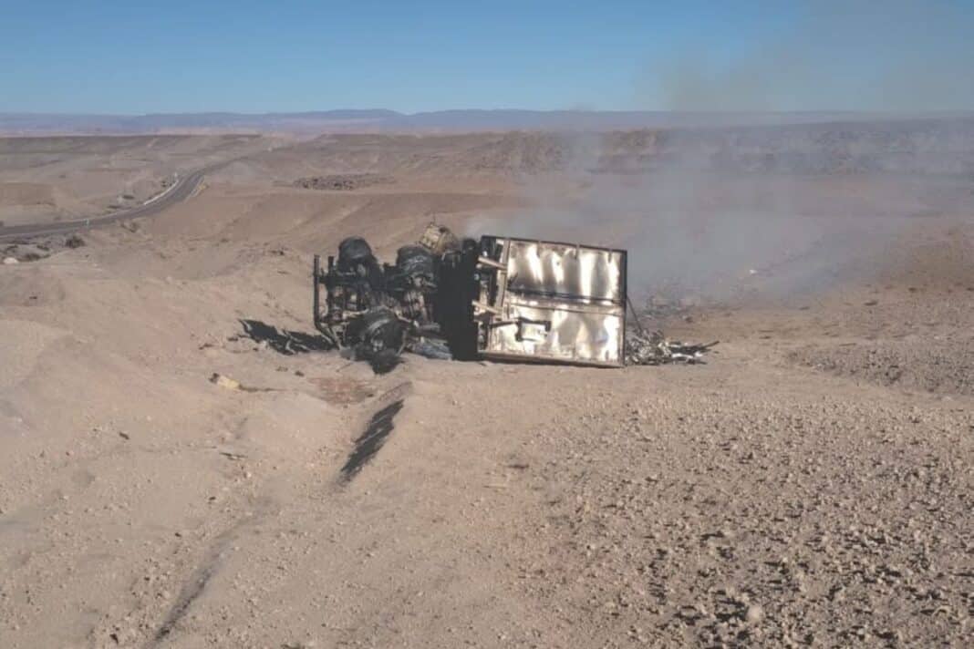 Cerca de las 21:10 horas de este martes, personal de la 2da. Comisaría de San Pedro de Atacama acudió al kilómetro 12 de la ruta internacional tras recibir alertas de conductores sobre un camión incendiándose a un costado del camino. Al llegar, los efectivos policiales confirmaron que se trataba de un tractocamión que se encontraba volcado. Según las primeras indagaciones en el sitio del suceso, no se advirtió preliminarmente la participación de otros vehículos en la dinámica del accidente.